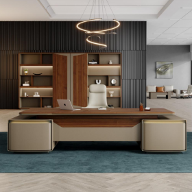 安格佳 KJKY-KMBT32-L 办公桌 老板桌 大班台 油漆大班台 油漆主管桌 经理桌 总裁桌 单人办公桌 工作桌 尺寸 3200W*2200D*760H 天然直纹胡桃+深卡其