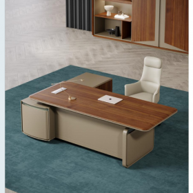 安格佳 KJKY-KMBT24-L 办公桌 老板桌 大班台 油漆大班台 油漆主管桌 经理桌 总裁桌 单人办公桌 工作桌 尺寸 2400W*1800D*760H 天然直纹胡桃+深卡其