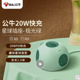 公牛/BULL GNV-U1303Q 插座 20W PD苹果快充星球插座/插线板/插排/排插/拖线板 半球型 3个五孔+3个USB GNV-U1203Q 极光绿