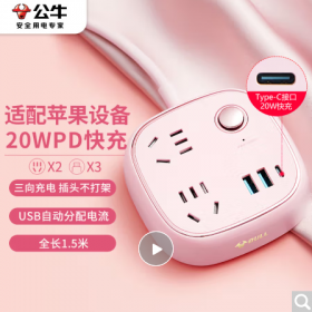 公牛/BULL GN-R602KQ 插座 20W PD苹果快充插座/插线板/插排/排插/拖线板 复古插座 3usb+2位五孔全长1.5米GN-R602KQ樱花粉