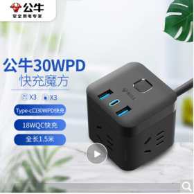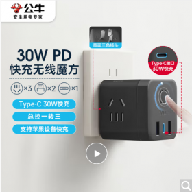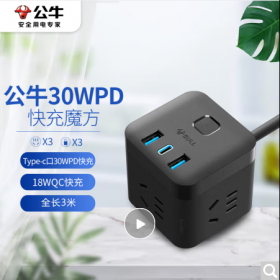 公牛/BULL GNV-M1303W 插座 30WPD苹果快充魔方插座/插线板/插排/接线板 Type-c口+USB口+3插孔 无线 黑色