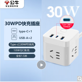 公牛/BULL GNV-UU2303B 插座 30WPD苹果快充魔方插座/插线板/插排/接线板 Type-c口+USB口+3插孔 全长1.5米白色