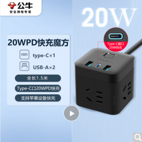 公牛/BULL GNV-UU2203H 插座 20W PD苹果快充魔方插座/插线板/插排/接线板 Type-c口+USB口+3插孔 全长1.5米黑色