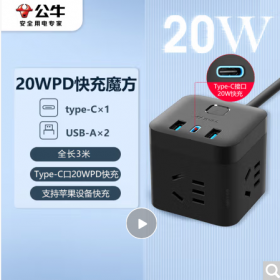 公牛/BULL GNV-UU2203H 插座 20W PD苹果快充魔方插座/插线板/插排/接线板 Type-c口+USB口+3插孔 全长3米黑色