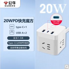 公牛/BULL GNV-UU2203C 插座 20W PD苹果快充魔方插座/插线板/插排/接线板 Type-c口+USB口+3插孔 全长1.5米白色