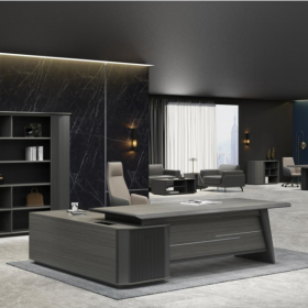 • 安格佳 KJFC-LB0224 办公桌 左 老板桌 现代简约 板油大班台 油漆主管桌 经理桌 总裁桌 单人办公桌 工作桌 尺寸 2400W*1820D*760H 马里深橡+铁灰+闪银国际灰