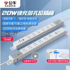 • 公牛/BULL GNE-P106EQ20 插座 20W快充PDU桌面过载超功率保护桌下电竞机柜插座/插线板/插排/排插 6位+USB 全长3米 防过载