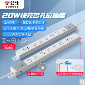 • 公牛/BULL GNE-P106EQ20 插座 20W快充PDU桌面过载超功率保护桌下电竞机柜插座/插线板/插排/排插 6位+USB 全长5米 防过载