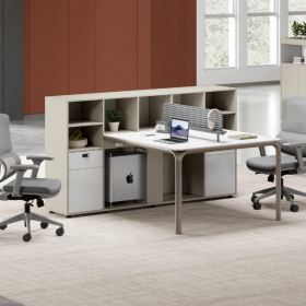 安格佳 KJBT-KBZY28-C 办公桌 尺寸 2800W*2800D*750H 职员桌 现代工作桌 4人位组合职员台 工位 屏风位 奶油灰+暖白 (桌屏:千岛鸟)