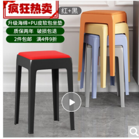 华盛H480 桌前椅 可叠放方凳加厚软坐垫休闲凳轻奢餐凳高板凳简约时尚凳创意北欧方 【红+黑】升级PU皮+海绵软坐垫-高48CM 承重260斤