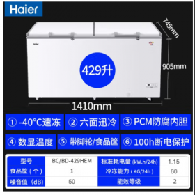 海尔/Haier HE429 冷藏柜 冰柜家用商用大容量零下负-40度/60度/-70度深冷急速冻海鲜冷冻柜 429升【-40度】双开门/一键速冻/电子控温