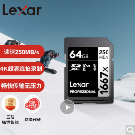 雷克沙/Lexar LMS1066128G-BNNNC U盘/存储卡 64GB 高速SD存储卡U3 V60内存卡读250MB/s 写120MB/s(1667X Pro版 写速大幅提升)
