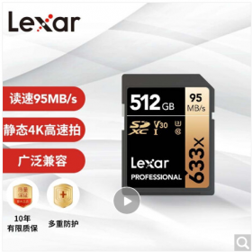 雷克沙/Lexar LSD512CBAP633 U盘/存储卡 512GB 读95MB/s 写45MB/s SDXC Class10 UHS-I U3 V30 SD高速存储卡(633x)