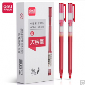 得力/deli A566 书写用笔类用具 0.5mm子弹头4倍书写大容量中性笔 笔芯笔杆一体化签字笔水笔 刷题必备学生 红色 12支/盒A566