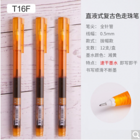 白雪/SNOWHITE T16F书写用笔类用具 速干直液式走珠笔复古湘黄色中性笔0.5mm针管型学生用笔简约时尚绘图用笔0.5mm 12支/盒